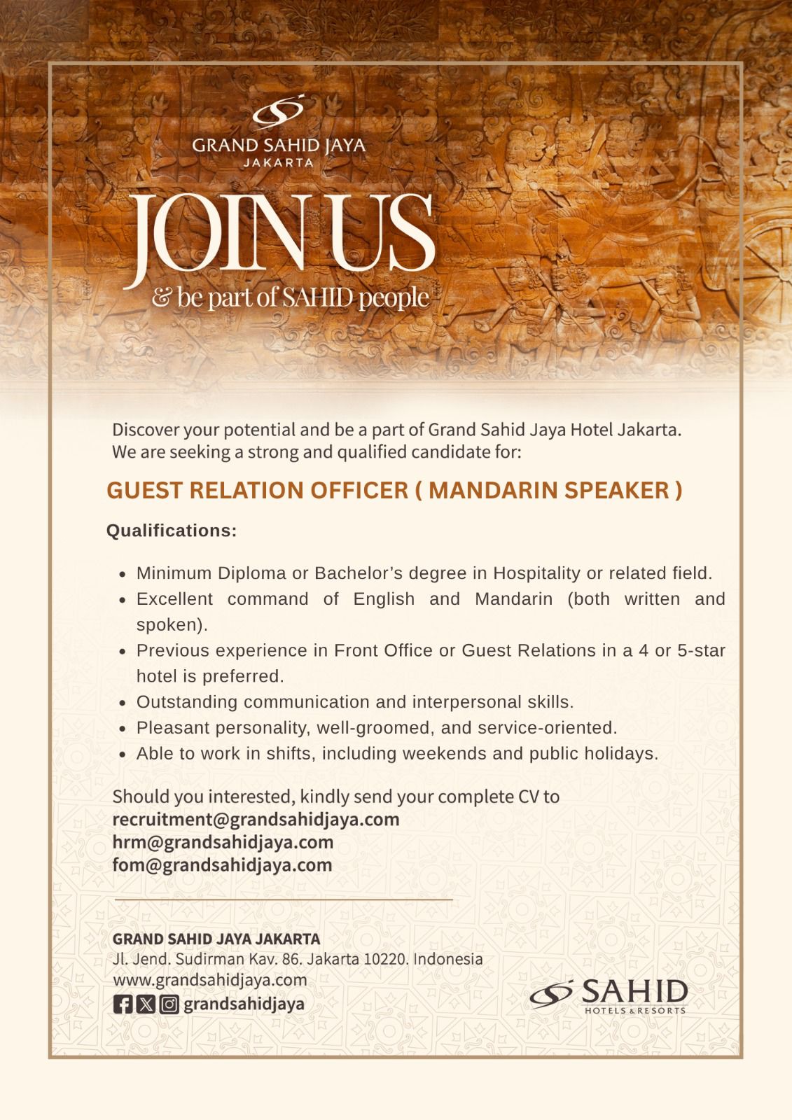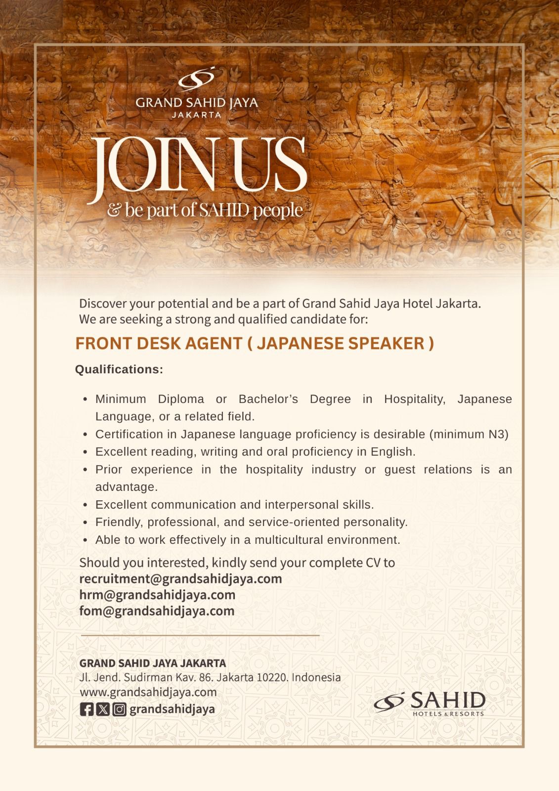 FRONT DESK AGENT ( JAPANESEE SPEAKER ) Minimum Diploma or Bachelor’s Degree in Hospitality, Japanesee Language or a realted field. Certification in Japanesee language proficiency is desirable (minimum N3) Excellent